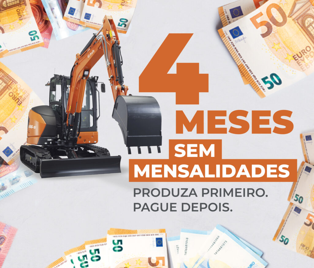 Exemplo: Valor de venda de 50.000€, contrato de locação financeira com duração de 28 meses, primeira renda de 5.000€, seguida de 4 períodos mensais sem pagamento de rendas, e após o decurso dos 4 meses de carência, 23 rendas mensais e sucessivas de 2.041,86€, valor residual de 500€. Acresce serviço de proteção do equipamento. Taxa fixa; TAN 3,99% e TAE 4,769%. Despesas iniciais de 350,00€, portes mensais de 5,00€. A todos os valores acresce o IVA à taxa legal em vigor. Campanha válida para clientes profissionais, até dia 30 de abril de 2026. Exemplo para equipamentos do tipo mini escavadoras. Financiamento sujeito a aprovação do BNP Paribas Lease Group, S.A.. Informe-se junto do BNP Paribas Lease Group, S.A., instituição financeira registada junto do Banco de Portugal sob o número 238, da DUROMIN e dos distribuidores oficiais DUROMIN em Portugal.