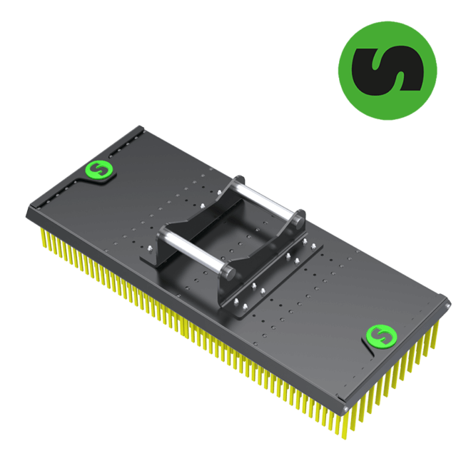A escova fixa tem vários usos e está adaptada para escavadoras. Pode varrer gravilha, remover neve de paragens de autocarro e celeiros ou varrer perto do trânsito sem risco de projeção de pedras. Design robusto, suporte tipo garfo para paletes como padrão.