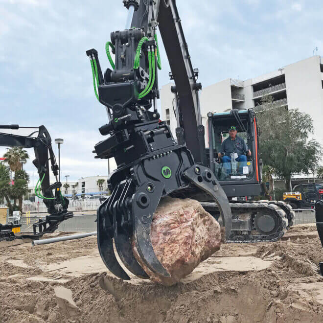 A bracket da garra apresenta um ângulo de 5°, alinhando perfeitamente o equipamento com o plano de rotação do Tiltrotator, o que melhora a precisão e o controlo durante a manipulação. Além disso, o sistema hidráulico incorpora válvulas de retenção de carga e acumuladores que asseguram um elevado nível de segurança durante a operação, prevenindo movimentos inesperados e garantindo a estabilidade da carga.