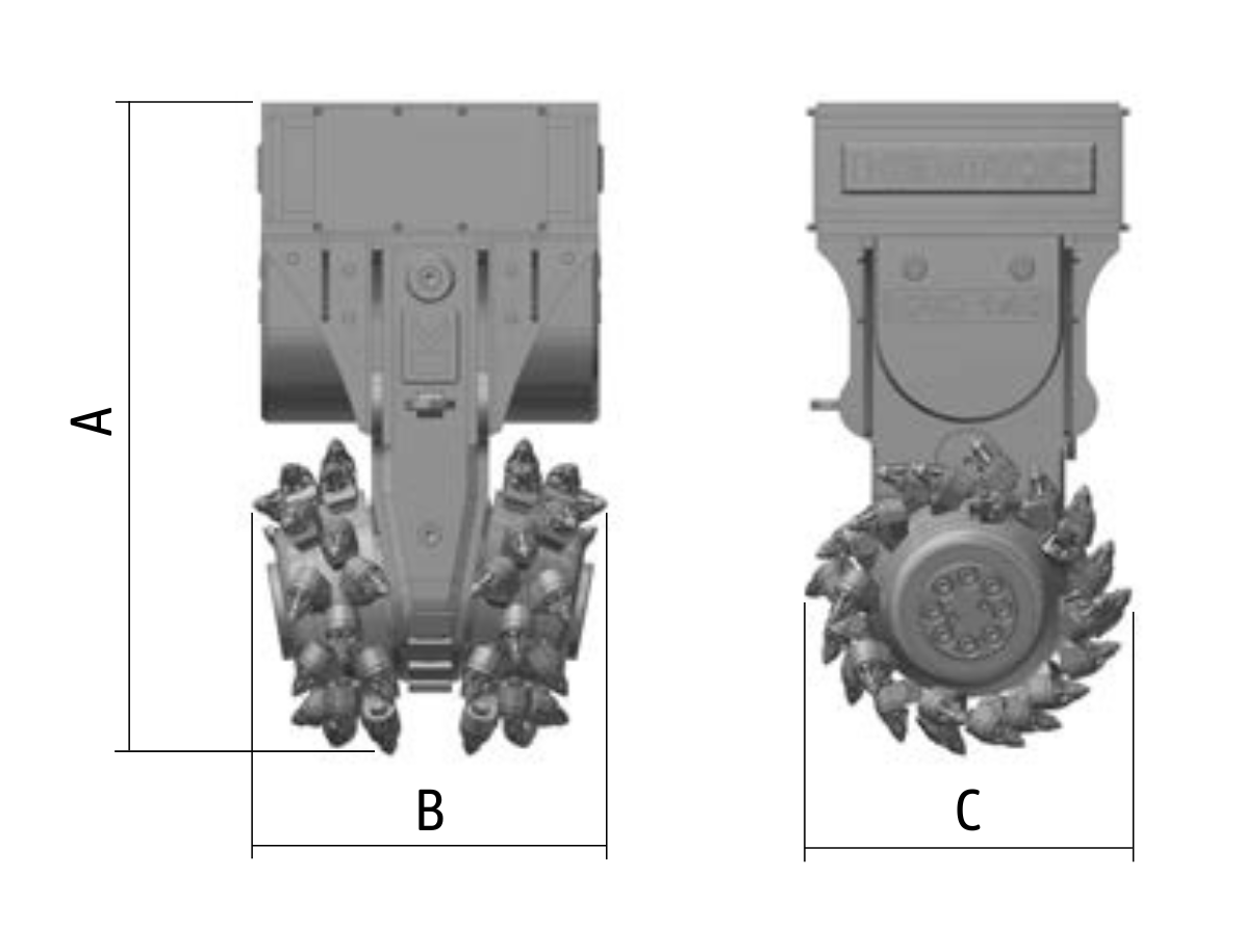 A fresadora Bullhead KRC 150 é indicada para escavadoras de 35 a 50 toneladas e tem dois tambores de corte dispostos em ângulo um em relação ao outro, de modo que os dois conjuntos de picas proporcionem uma cobertura total frontal sem qualquer lacuna entre eles, eliminando a necessidade de oscilar o cortador de um lado para o outro.