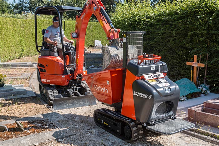O mini dumper de rastos Kubota KC70VHD‑4, com função de despejo alto, descarrega até 1,43 m de altura (altura do pino). O alcance de descarga de 447 mm permite afastar facilmente a carga da lateral do camião.