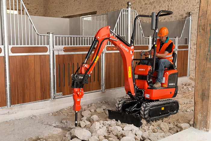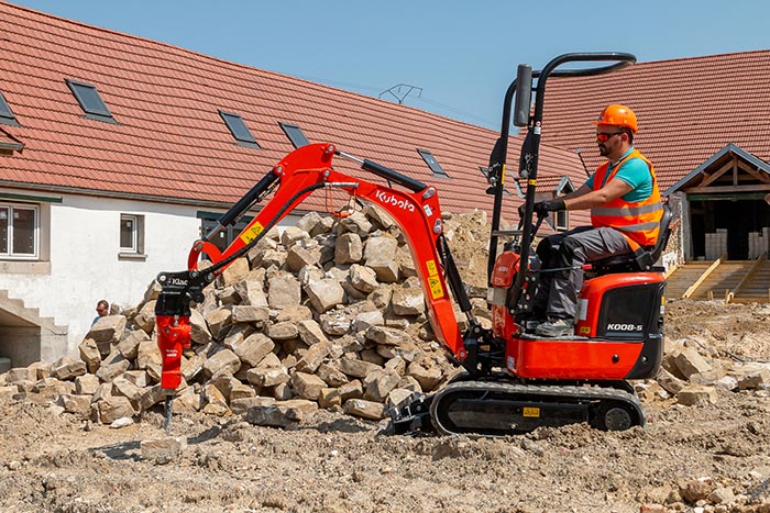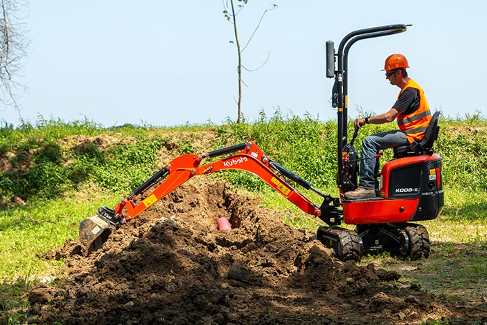 A mini-escavadora de 1 tonelada Kubota K008-5 apresenta um excelente rendimento em espaços reduzidos.