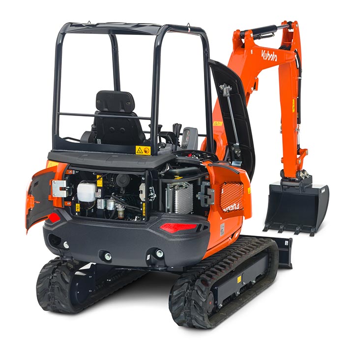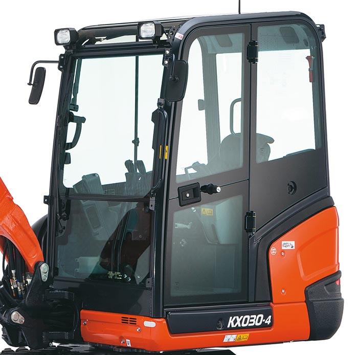 A KX030-4 está equipada de série com uma gama completa de caraterísticas de segurança, desde ROPS/OPG a pontos de montagem para proteção da janela frontal, porta e capot de abertura total.