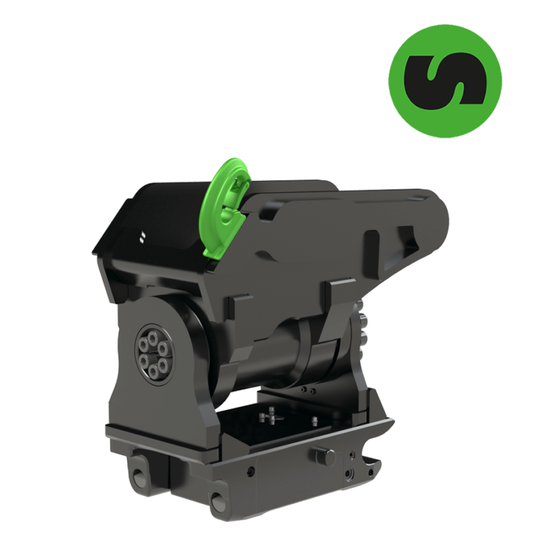 O modelo XT da Steelwrist incorpora uma estrutura em aço fundido, pinos expansores para encaixe sem folgas e um torque de inclinação elevado que permite movimentar a ferramenta até 90° para cada lado. Está disponível com bloqueio ou gancho de pino frontal para trocas seguras de acessórios.
