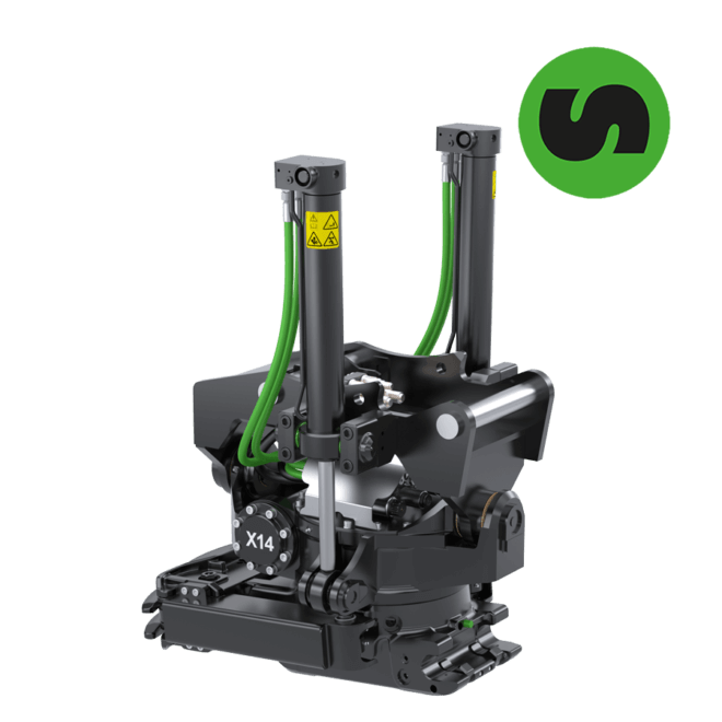 O X14 integra um engate rápido que segue o padrão simétrico (S-standard), equipado com o sistema de segurança Front Pin Lock (FPL). Este mecanismo bloqueia mecanicamente o eixo frontal, minimizando o risco de desprendimento acidental dos acessórios. O Tiltrotator é fornecido com um sistema de controlo compatível com a escavadora, disponível em configurações de duas ou quatro mangueiras.